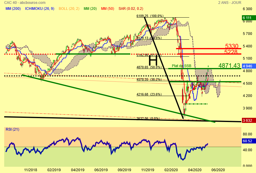 Ce seuil des 4871 points est très important pour la suite , il représente le retracement de Fibonacci des 50% , on est donc parti rejpoindre le fibo suivant des 61.8% avec tenez vous bien 11 % de Récession c' est beau n' est ce pas , car nous sommes en récession d' une ampleur jamais connu et le Cac se permet la hausse qu' il convient de suivre je le répète .