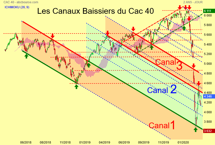 Le cours du Cac 40 navigue dans le canal baissier bleu 2 , il y a bien eu une tentative de sortie haussière de ce canal pour revenir dans le canal baissier 3 mais ce fut un échec avec retour dans le canal baissier 2.