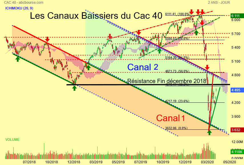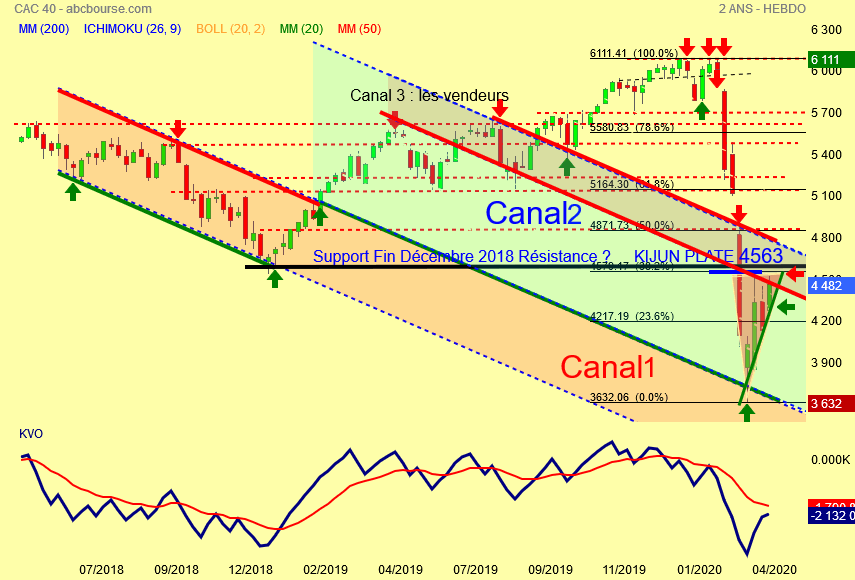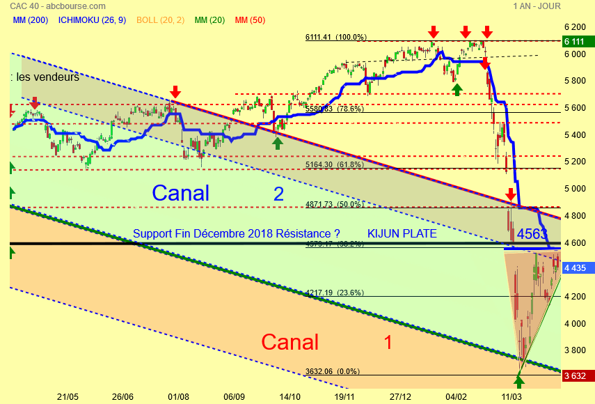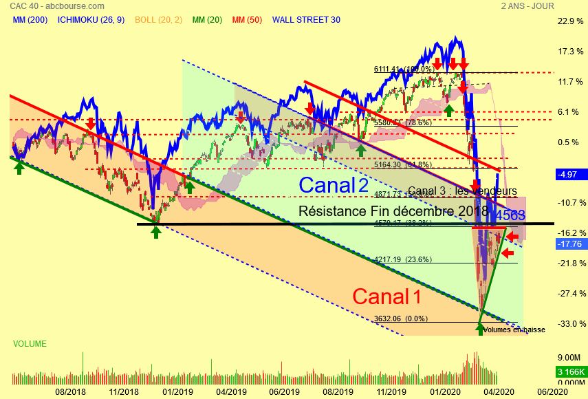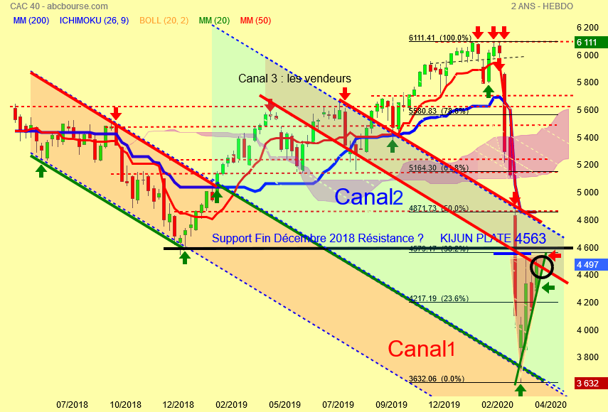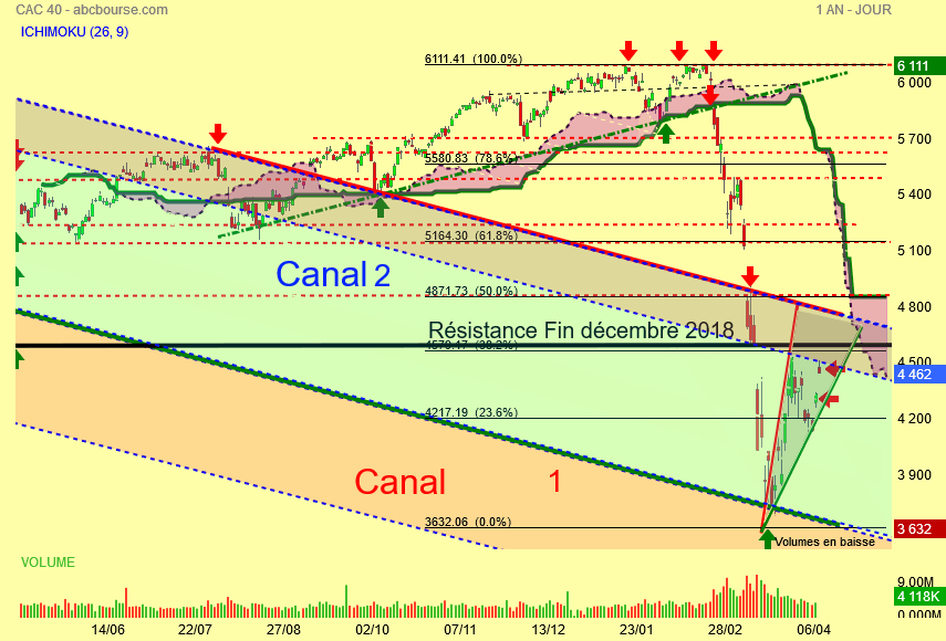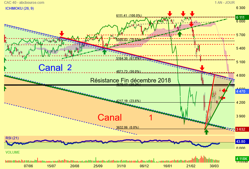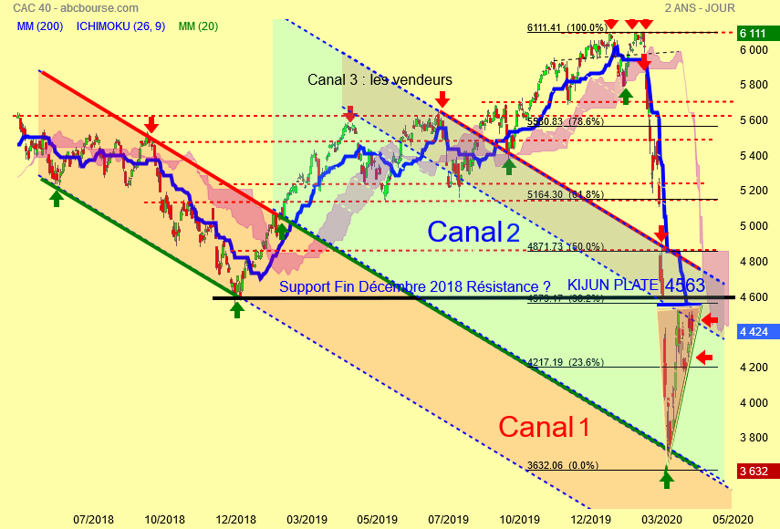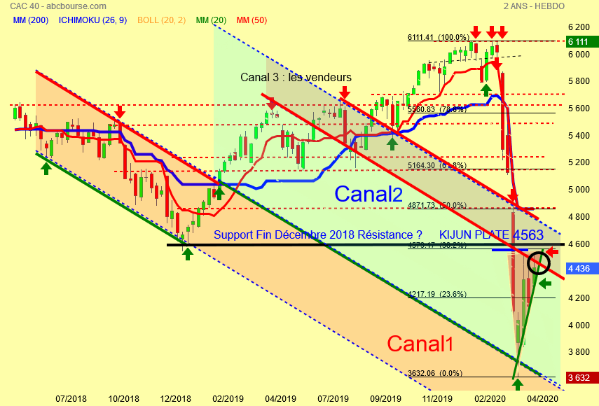 Conclusion : tendance haussière à accompagner jusqu' au support noir devenu résistance de fin décembre 2018 ( 4580 - 4610 points ) qui n' était autre que le commencement de la dernière phase haussière tout au long de 2019 et début 2020 jusqu' au 19 Février à 6111 le point haut de cette hausse .