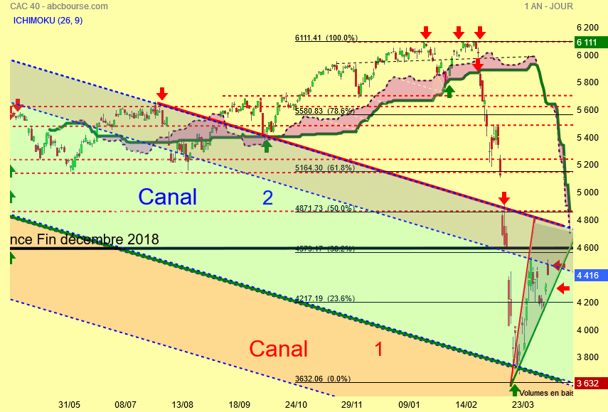 La clarté du graphique , sa logique est que l' on rejoigne le support noir de fin décembre 2018 dans la zone des 4600 points à ce sujet cela correspond à peu de chose près des 38.2 % de retracement de Fibonacci .