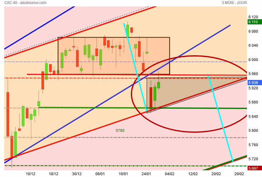 Baissier discipliné: Le plus bas d'hier à 5846,45 s'est arrêté juste au-dessus de la MMA 89 haussière située à 5844,26. Le robot n'a pu cacher que le CAC faiblissait car la pente de la 89 s'adoucit légèrement même si elle reste montante.