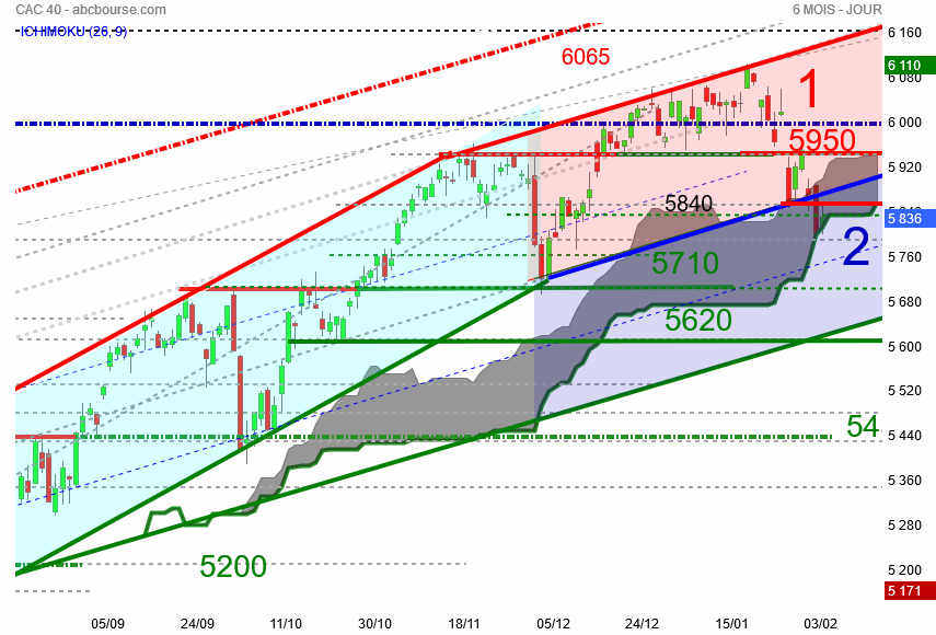 Pour son côté futé, le CAC a un tendon d'achile: sa Katana! La Tenkan-sen a baissé hier de 5980,41 à 5970,27 et la kijun a commencé à suivre en baissant de 5980,41 à 5978,13.