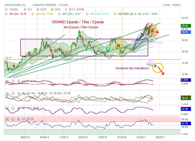 On est actuellement en surachat beaucoup trop important pour que ça dure. Les indicateurs vont devoir abdiquer à la baisse. Le fait de casser pour la troisimère fois consécutive le support haussier en pointillés vert accentuera la pression baissière.