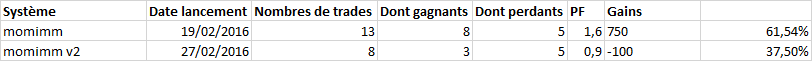 2 trades : 1 gagnant et 1 perdant pour la v1 et 2 perdants pour la v2. c'est la première fois que les résultats des deux versions divergent. Logiquement le PF est de plus en plus bas.