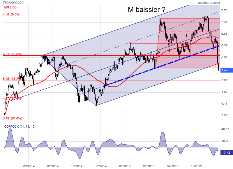 (CercleFinance.com) - Technicolor valide une franche cassure du support des 6E (du 28/09/2015): c'est la base du 'M' baissier amorcé sous 7,45/7,55E et le titre menace l'ex-plancher des 5,70E d'avril à juillet 2015.