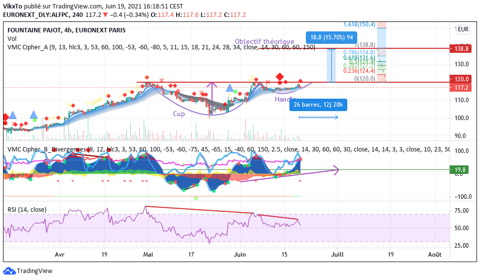 Pour ma part, je pense qu'un trade de continuation est prenable sur la valeur sur breakout (au niveau des 121€ donc). Un stop obligatoire devra être placé à minima vers 114€, nous avons en effet des death cross en embuscade et le SAR vert qui ne demande qu'a percuter la courbe.