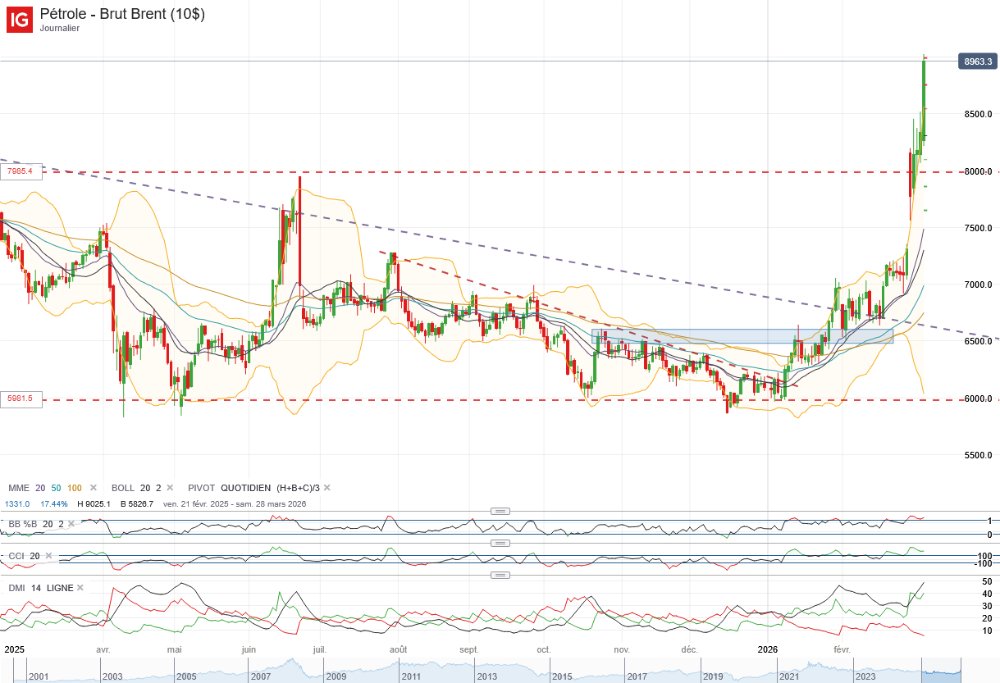 SINGAPOUR, 9 mars (Reuters) - Les prix du pétrole se sont envolés lundi sur le marché asiatique, dépassant la barre des 100 dollars le baril (86,57 euros) et atteignant leur plus haut niveau depuis mi-2022, une série de grands producteurs réduisant leurs approvisionnements et les perturbations du transport maritime dans le détroit d'Ormuz se poursuivant dans le contexte du conflit au Moyen-Orient.