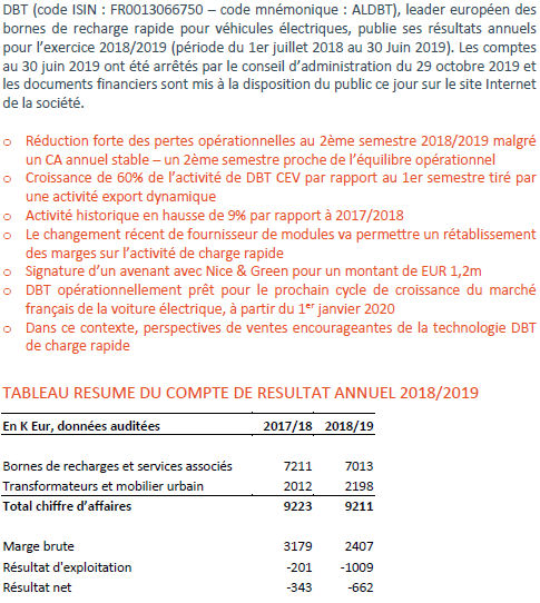 DBT s'est associe en Chine il y a 1 an avec Zhongshan BRS EVCT, une entreprise chinoise (?) qui doit, si mes souvenirs sont bons, acheter avant fin 2019, 250 chargeurs, soit une belle commande pour DBT. Qu'en est-il? aucune nouvelles....rien, meme pas de la part de DBT.