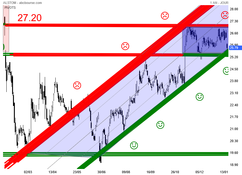 je vous propose ce graphique en vue journalière à 1 an , le cours navigue dans le superbe canal haussier bleu , il vient de se promener à l' intérieur du Rectangle bleu , je me méfie de ce gap de rupture en bear trap possible pour reprise d' appui sue la zone 25 - 25.20 euros , on est rentré par le bas dans le rectangle , la sortie logique est vers le haut avec pour objectif 29.40 voire 30 euros en cas de sortie baissière objectif de baisse à 23 voire 23.20 euros .