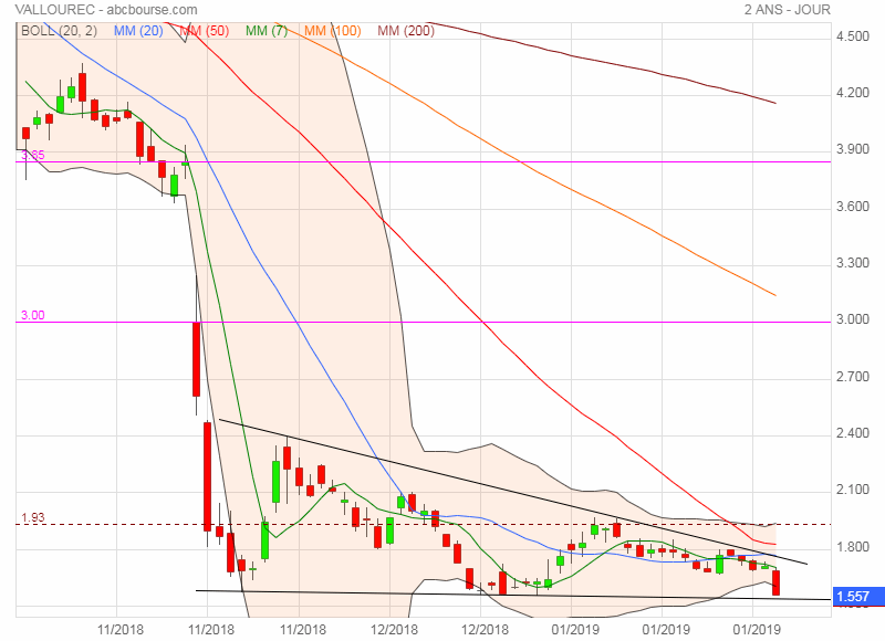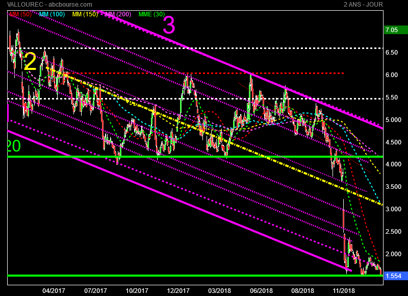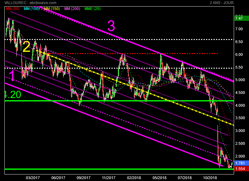 Dans ce contexte il se pourrait que Vallourec ne baisse plus sous les 1,50 euros au moins jusqu'à la prochaine publication prévue le 20 Février 2019. Maintenant c'est comme dit précédemment surtout entre les mains des fonds qui shortent la valeur. Eux peuvent toujours s'amuser à faire rebondir le titre jusque vers 2,50 à 3 euros avant de le faire replonger jusqu'à 1,50 euros pour passer le temps en gagnant dans les 2 sens. Je ne suis pas certain que l'analyse graphique sera suffisante pour expliquer les futurs mouvements.