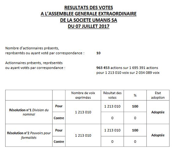 Les actionnaires de la société UMANIS sont informés qu'une Assemblée Générale Extraordinaire se réunira le vendredi 7 juillet 2017 à 9 heures 30 au siège social situé 7-9, rue Paul Vaillant Couturier – 92300 Levallois-Perret, à l'effet de délibérer sur l'ordre du jour et les projets de résolutions suivants :
