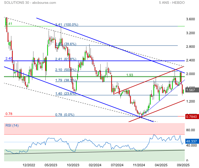(Boursier.com) — Solutions 30 s'écroule de près de 20% à 1,30 euro au lendemain de son point intermédiaire marqué par une perte nette de 16,8 ME pour un chiffre d'affaires consolidé de 467,4 ME, en recul de -9,7% (-10,5% en organique). Le groupe ne donne pas de guidance pour 2025 mais confirme maintenir la plupart de ses grands objectifs moyen terme du Capital Markets Day (développement de l'Allemagne, de l'Energy, taux d'EBITDA supérieur à 10% sur les grandes zones) sauf sur la France où la situation actuelle pèse même si toutes les pistes de redressement sont envisagées, souligne TP ICAP Midcap. Le broker évoque ainsi des résultats semestriels décevants avec en point central une chute dans la Fibre en France. Malgré les mesures de réorganisation annoncées et des points de satisfaction sur certains pays, le courtier revoit à la baisse ses estimations et son cours cible de 2,3 à 1,7 euro. Le potentiel est désormais limité dans un contexte de déceptions répétées et de manque persistant de visibilité sur les résultats... L'analyste choisit de dégrader le dossier à 'conserver'.