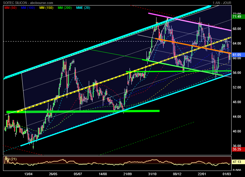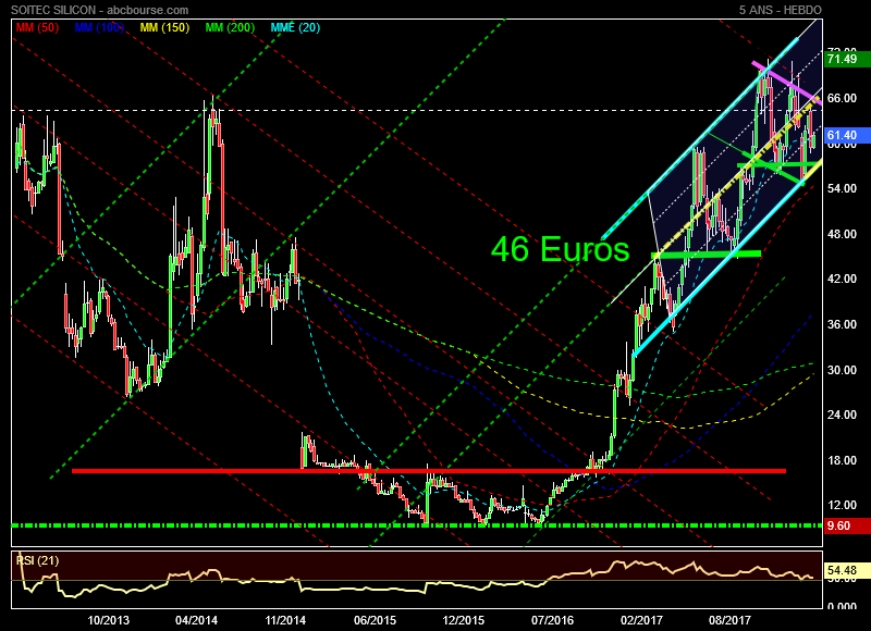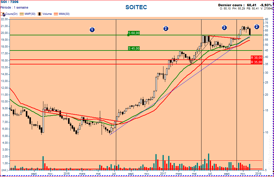 Pour ce qui est de soitec , le cours reste au dessus de la MMP30, pour que l'on commence une phase 3 il faudrait un applatissement de la MMP30, ce n'est pas encore le cas, mais la volatilité revient on pourrait penser à un début de phase 3 avec plusieurs contacte d'une borne à l'autre ,(d'où le double top) et là phase 3 peut être aussi d'une durée longue ou courte selon les cas ,il suffit de voir le comportement d'un titre.