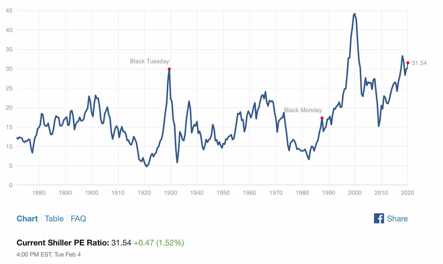 Il n'y a que 2 autres moments ou cet indice est arrivé à 30 et au dessus. Et les moment boursier ont conduit à une grande dépression économique avec l'éclatement de bulles.