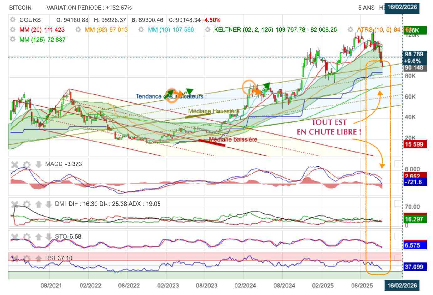 Prochaine étape probable : l'enfoncement de l'ATRS bleu à 84158 $ et retournement en mode baissier "orange".