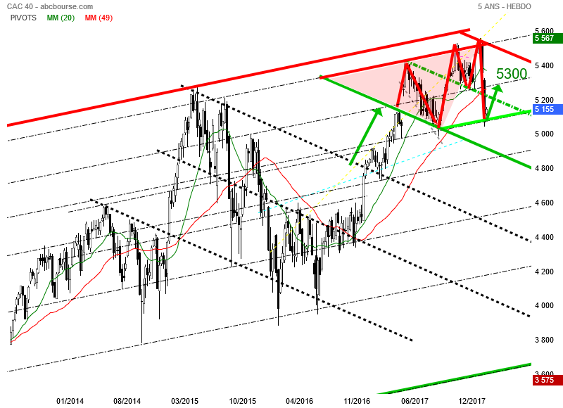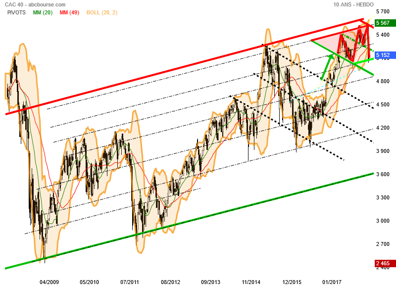 Toute la promenade du Cac 40 se passe depuis le 24 avril 2017 : Election de Macron , miroir aux alouettes ? Trop tôt pour le dire , faut donc suivre la promenade du Cac à l' intérieur de la figure , objectif 5300 points pour le sursaut technique , question de desserrer l' étau baissier quelque temps .