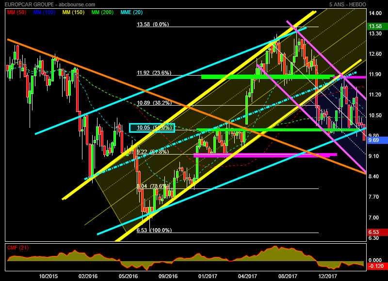 Maintenant c' est très clair , nous sommes rentrés dans le canal baissier rose avec comme objectif de baisse , le fibo suivant des 61.8 % à 9.22 euros voire les 9.10 euros support rose .