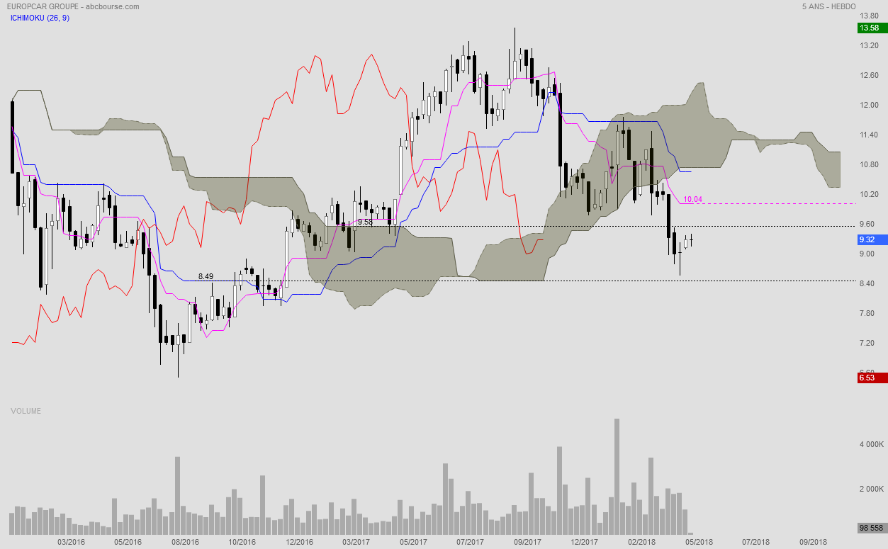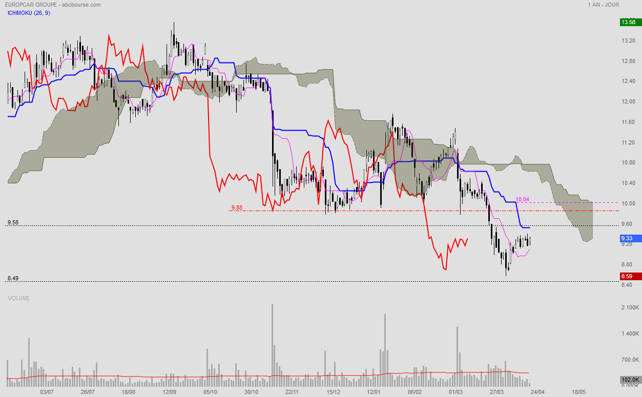 Si la baisse perdure alors direction les 8.40 euros soit la résistance oblique baissière orange devenue support .