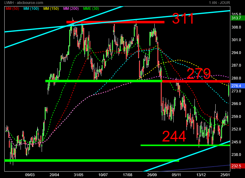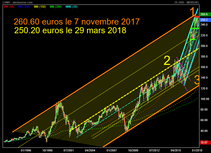 LVMH a réalisé son plus haut à 260.60 euros le 7 novembre 2017 , cela va faire 4 mois qu' il n' y a plus de tendance claire puisque nous sommes rendus à 250.20 euros le 29 mars dernier .