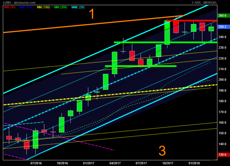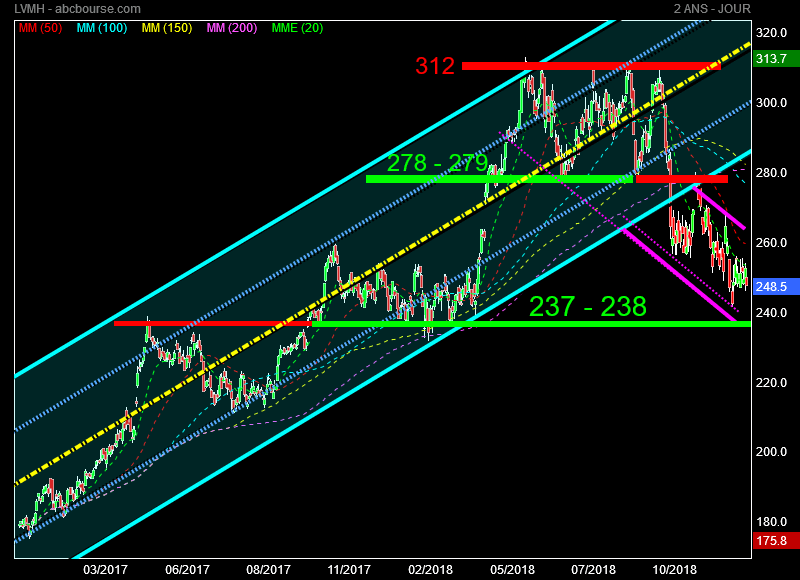 Mon offensive graphique sur le luxe se poursuit ce matin avec LVMH avec un cours enregistré à 248.80 euros dans une version 2 ans jour.