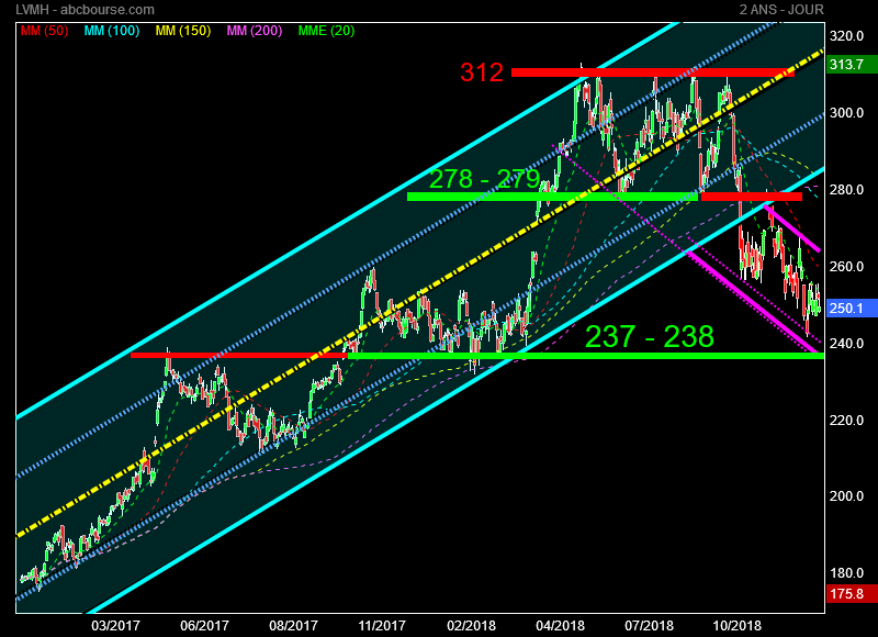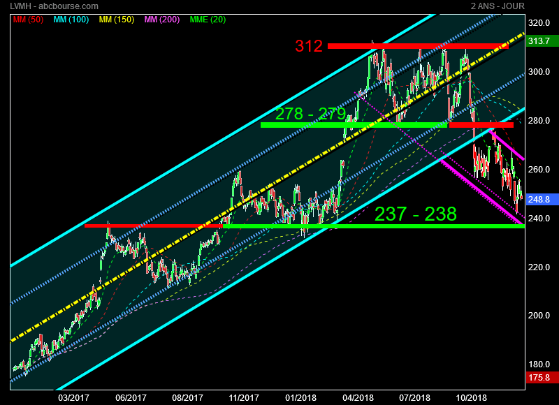 Suite à la cassure , le cours a chois un nouveau petit canal rose cette fois .Premier objectif baissier les 237 - 238 euros .