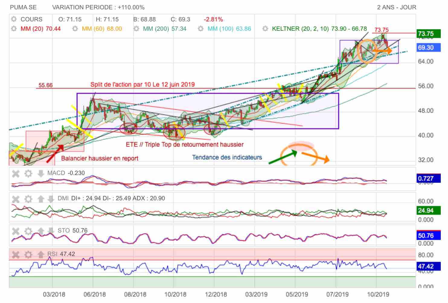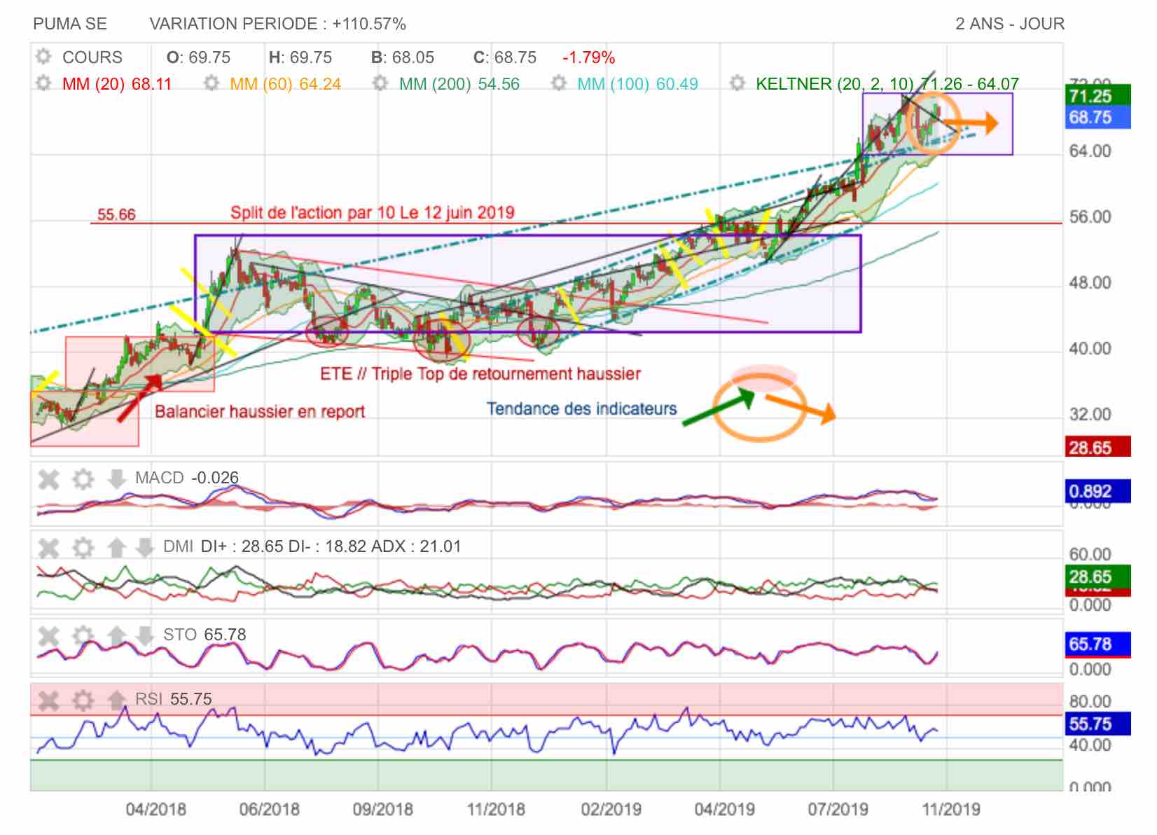 Dans l'attente de Résultats pour le T3 /2019 le 24 octobre 2019, on devrait consolider latéralement que les niveaux actuel sous 72 euros et au dessus de 64 euros.