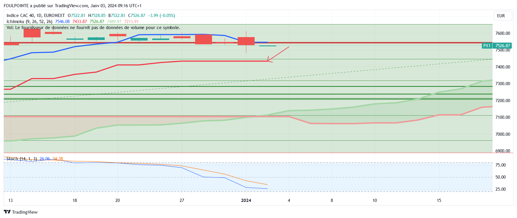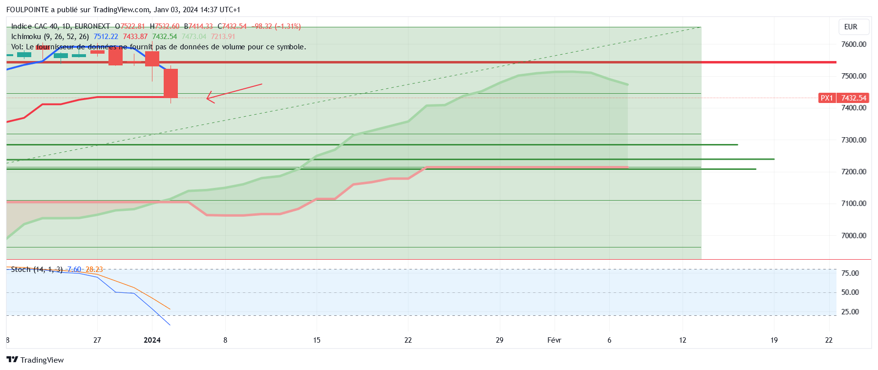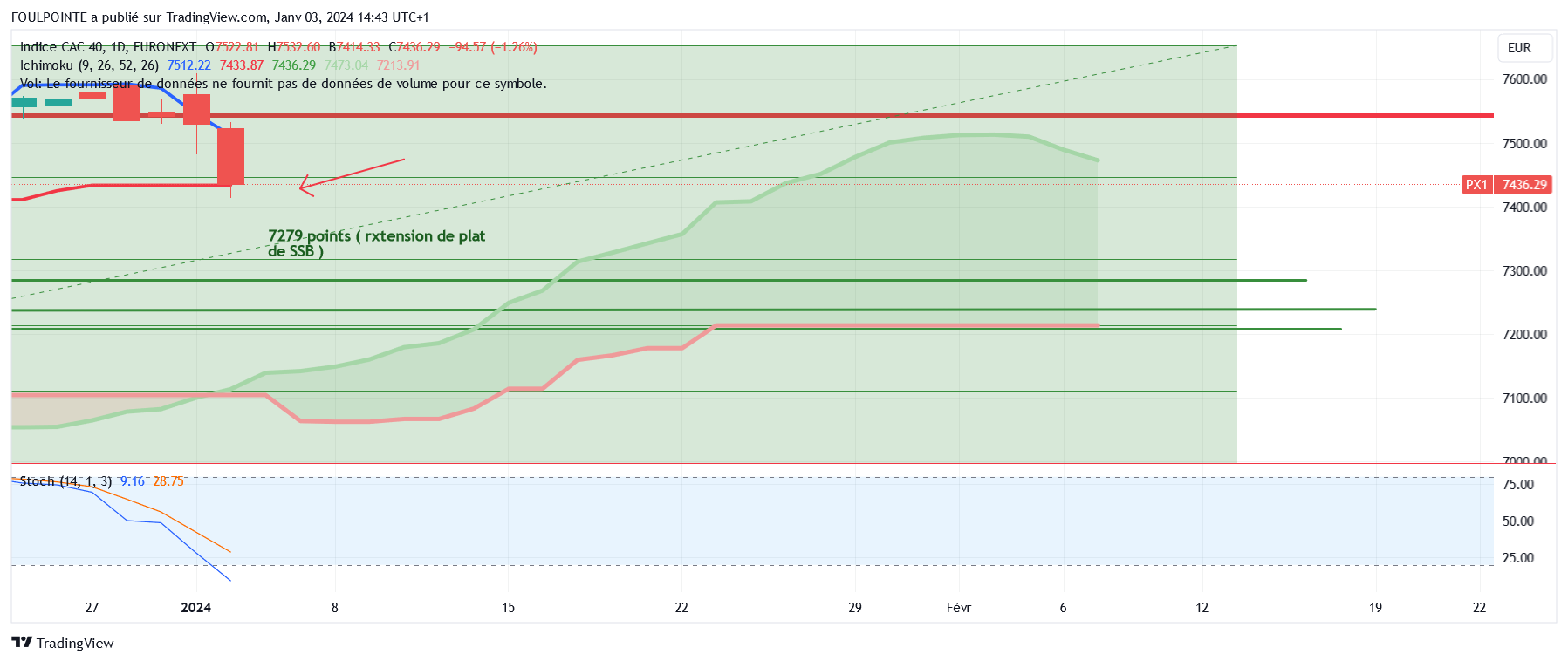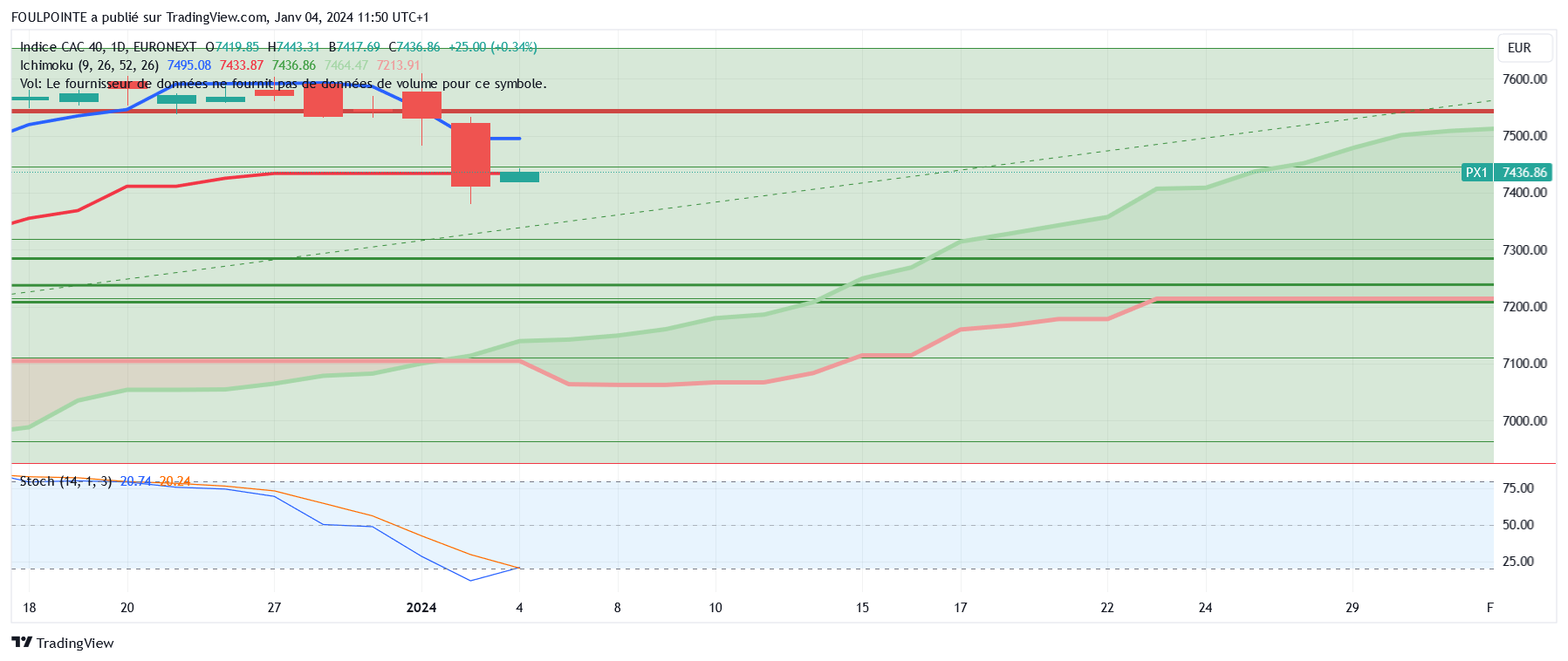Graphiquement, les cours font un pull back sur les 7433 points. On est sur les 7436 points, à 3 points au-dessus de la kijun.