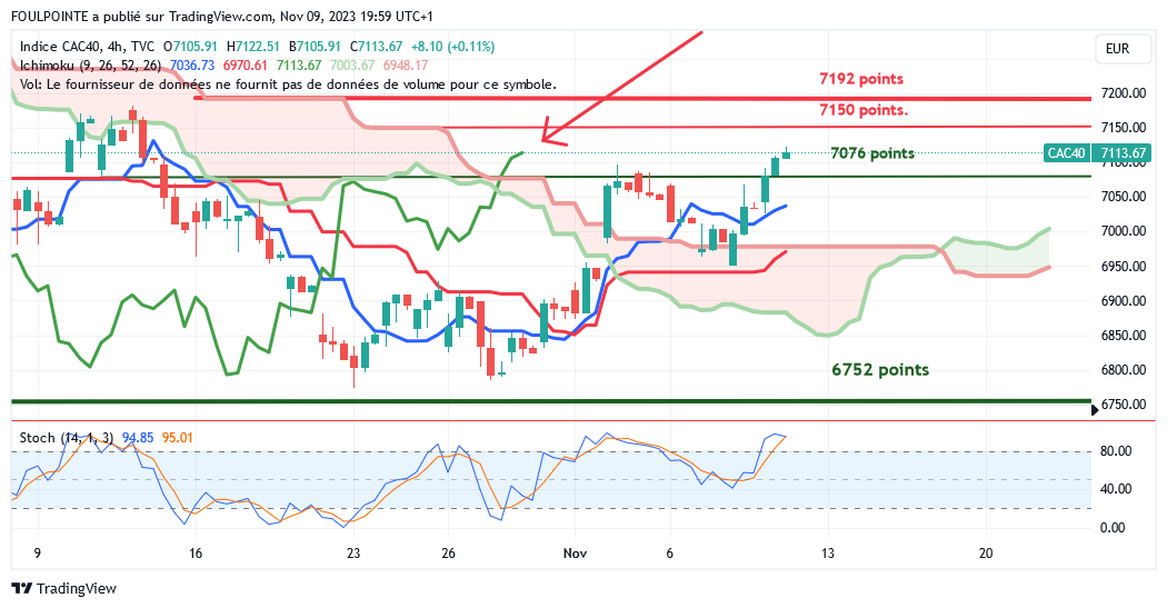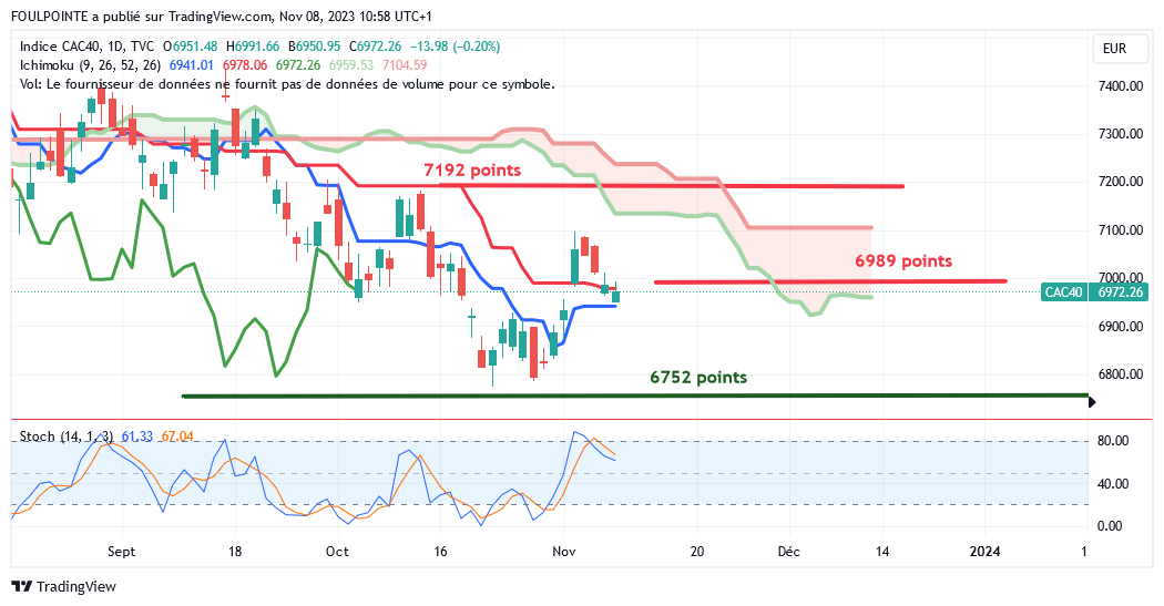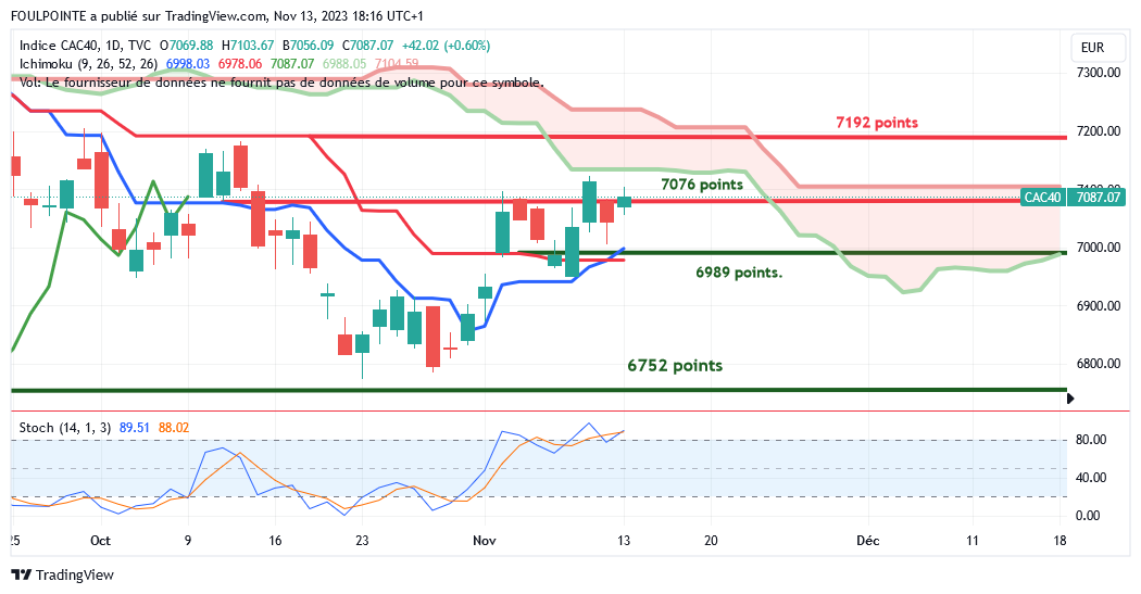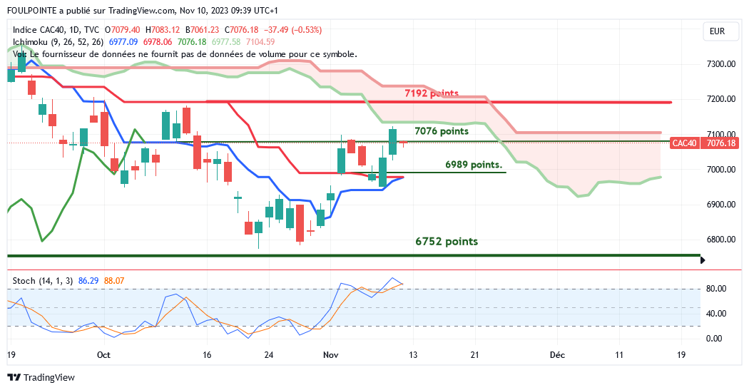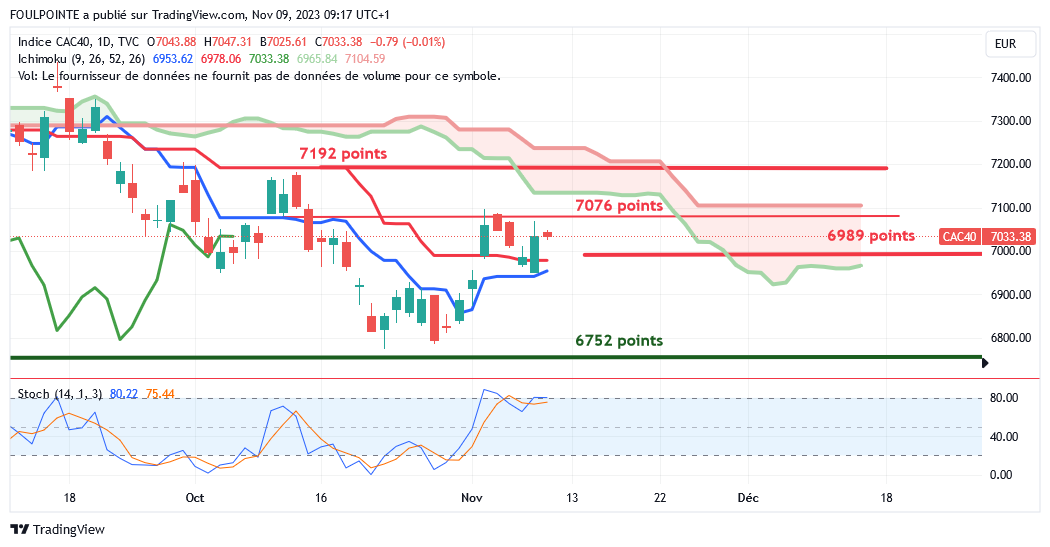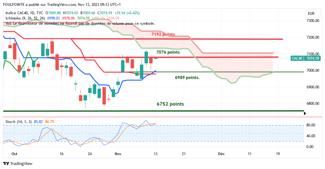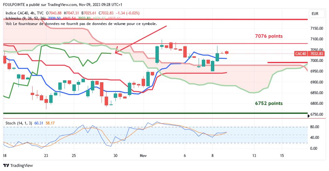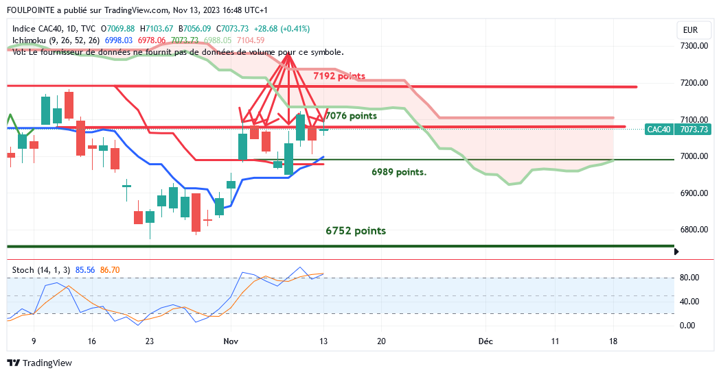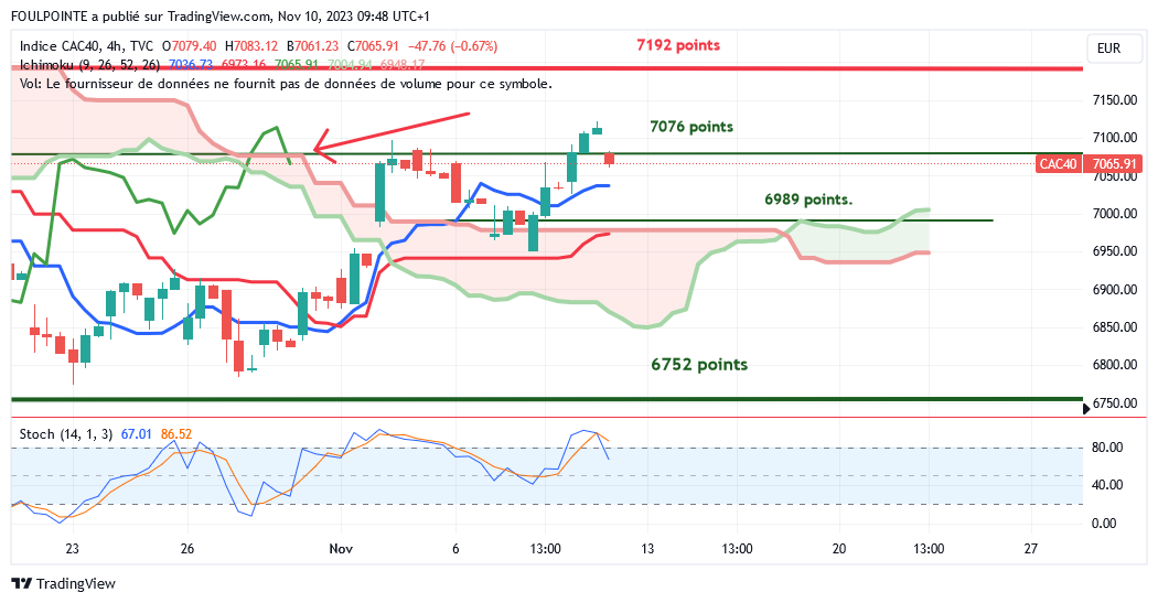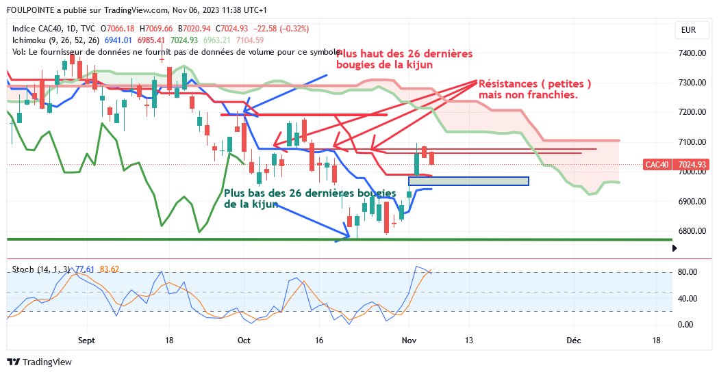 " La petite résistance des 7062 points ( petite extension d'un plat de kijun ) n'ayant pas été franchie par le cac, le gap haussier du 02/11/2023 devrait être refermé et la tenkan, actuellement sur les 6941 points devrait de nouveau être touchée.
