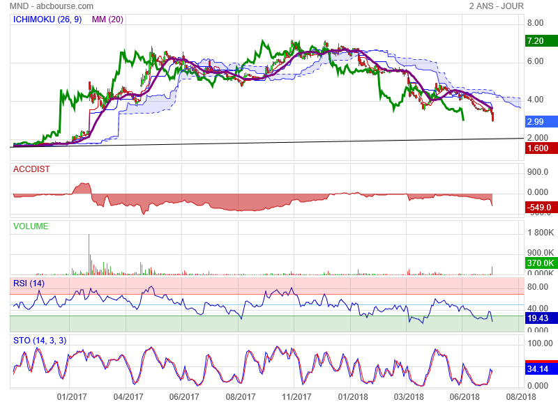 J'ajoute qu'ici , l'analyse selon weinstein semble être plus adaptée : après une phase 3 ( stagnation après une hausse ) l'action entre en phase 4 ( chute rapide en boule de neige ) : les gens se précipitent pour vendre et il n'y a pas d'acheteur en face.