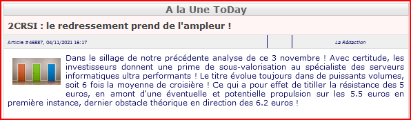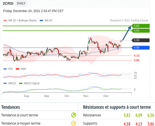 2CRSI : 15j▲/1AN▲▼▲▼▼▲ +16.24% /->01-2022 (5.2€) /->02 (6.0€) /en 03 ▼ (5.0€) /T2 ▲->mi-06 (5.9€) / T3 ▼ de mi06 à mi-07 (5.5€) reprise▲▲-->deb-08 (6.10€) puis ▼▼ 08->10 (4.8€) /▲->01-2023 (5.5€)