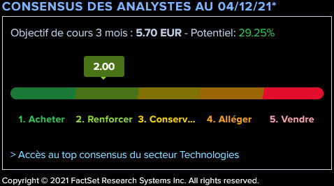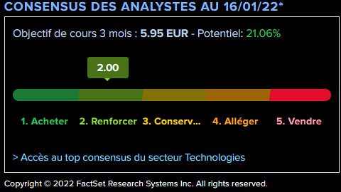 "Les inquiétudes qui pesaient sur le bilan sont dissipées car « la résolution Blade a permis de récupérer 12,6 millions d'euros de cash et 16 millions d'euros de matériels revendables ». Les craintes sur une potentielle augmentation de capital sont elles aussi un lointain souvenir, « le cash n'étant plus un sujet », selon le bureau d'études nantais. Avec un chiffre d'affaires atteignant le double de sa capitalisation, « le titre porte encore les stigmates de son histoire boursière compliquée ». Portzamparc estime que le chiffre d'affaires au second semestre sera en croissance de 9,6% et que le cours de l'action a un potentiel de croissance de 55%. ""