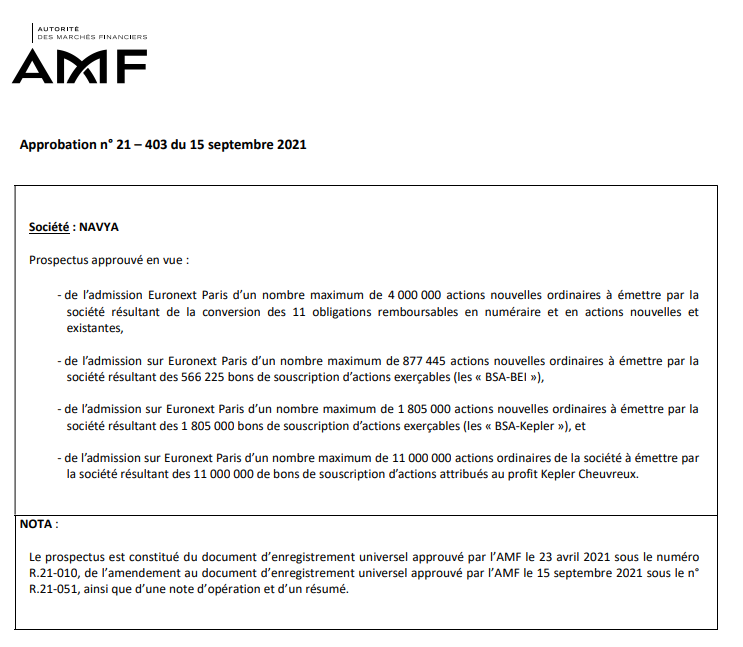 Cette opération a été mise en œuvre conformément à la 22ème résolution de l’Assemblée Générale des actionnaires du 4 juin 2021 et a donné lieu à un prospectus d’admission visé par l’AMF (n° de visa 21-403 en date du 15 septembre 2021 et accessible ici) lequel couvre également l’ensemble des actions potentielles à émettre sur exercice des valeurs mobilières susceptibles de donner accès au capital déjà émises et annoncés par NAVYA entre 2018 et 2020 et contient notamment une section 2 (page 15 et suivantes) sur les facteurs de risque ; étant rappelé que par nature ces instruments sont susceptibles de générer une dilution.