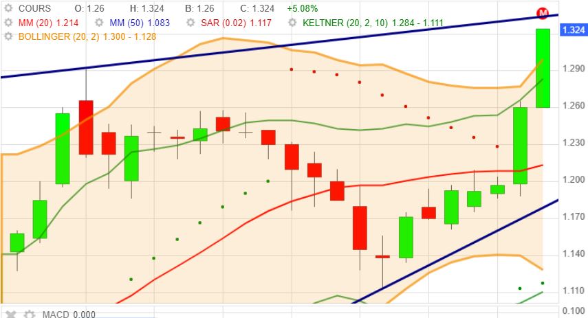 Good job, superbe Marubozu et croisement de la MACD, gros achats à la clôture (la VAD prend 50% de MV) qui laisse augurer une prolongation de la hausse avant une consolidation saine. Mettre un stop 1,30/1,32 suivant l'ouverture.