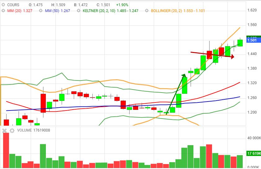 Une consolidation pas très franche, les acheteurs et les vendeurs se disputent la main (un jour rouge, un jour vert), la VAD a encore augmentée à 4%. Si les volumes restent conséquents ou augmentent et les US vertes le cours aller tester les 1,60 restent possible par contre rentrer à un cours aussi élevé reste un risque non négligeable. Si les HF lâchent la consolidation peut être importante.