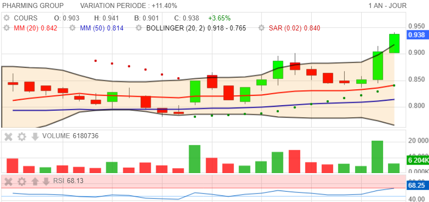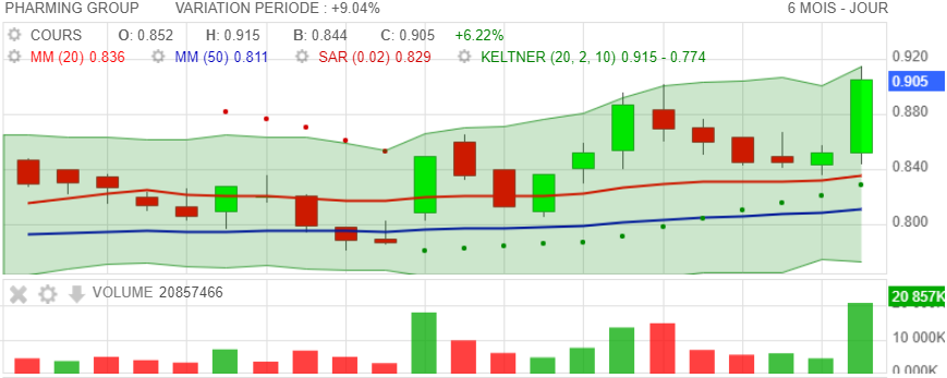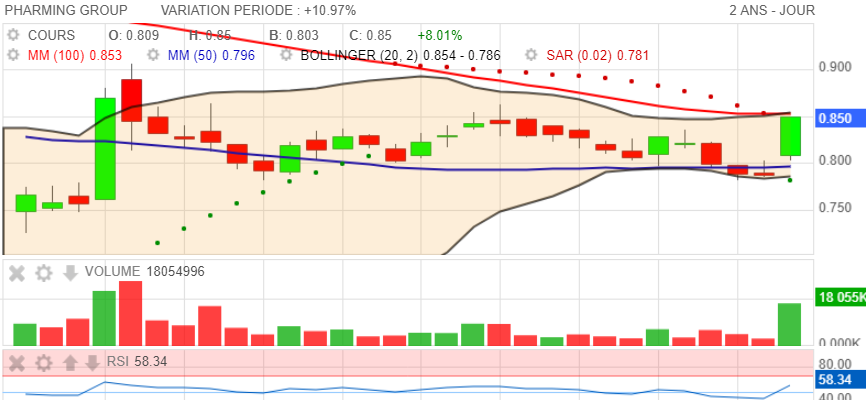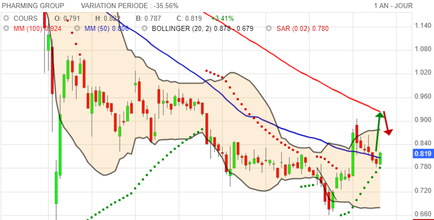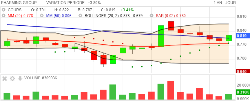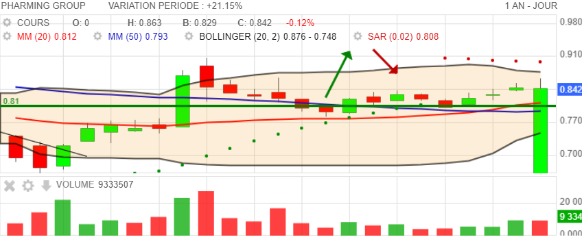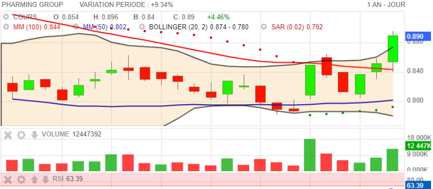 Belle sortie par le haut de la Bollinger avec un plus haut à 0;896 et une clôture à 0,8875 et +4,17%. Les voyants sont verts mais le titre a sans doute besoin de corriger.