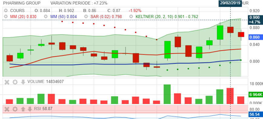 A court terme (2 semaines) le plafond 0,90, je pense que cela devrait stagner un moment entre 0,9 et 1 euros sauf news, la VAD diminue régulièrement ce qui est un bon signe pour une hausse durable. la publication des résultats 2018 le 7 Mars 2019 que le marché devrait anticiper, toute hausse de la limite haute de la Bollinger sera corrigée dans les jours suivants.