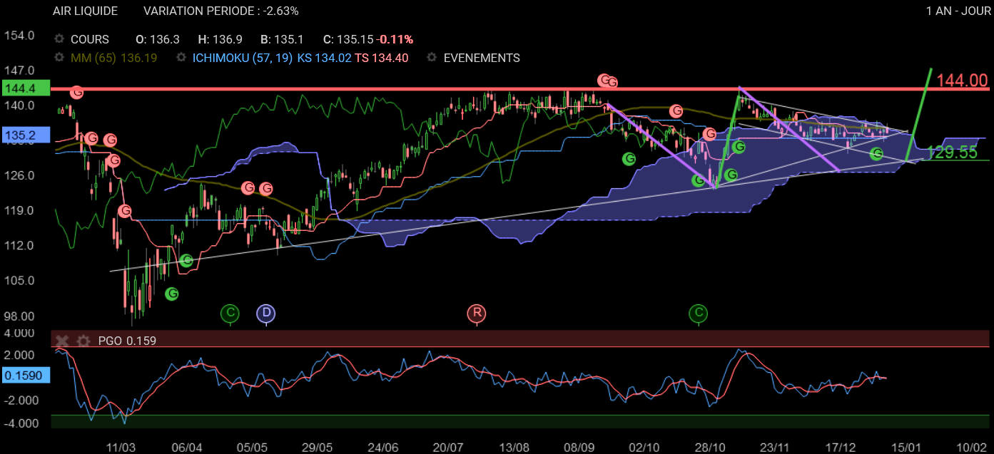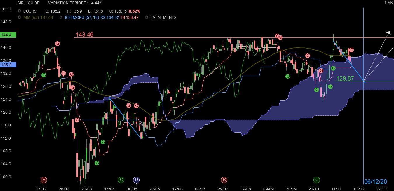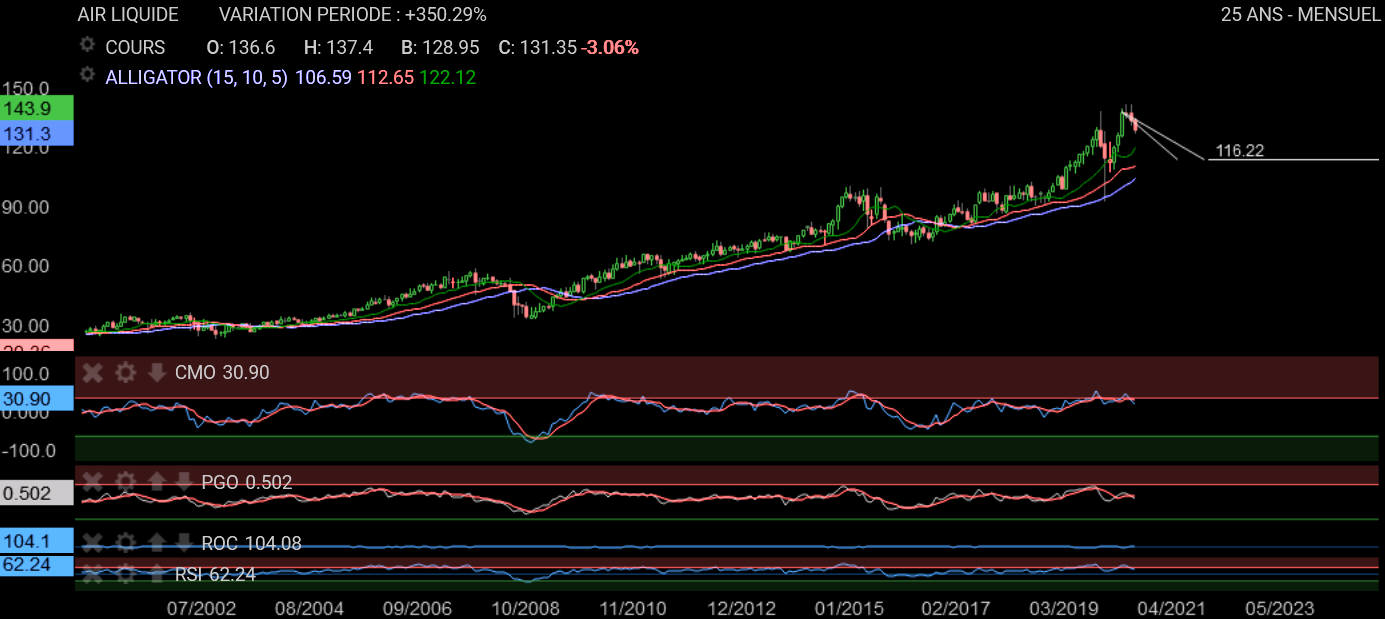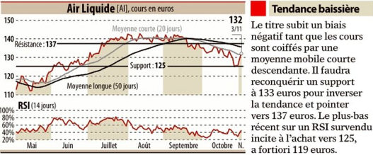 2 ) Air liquide , après une phase 3 de S. Weinstein, est passé en phase 4 (fort logiquement) . C’est à dire dans un canal baissier.