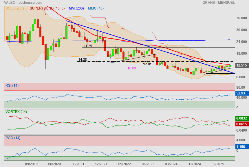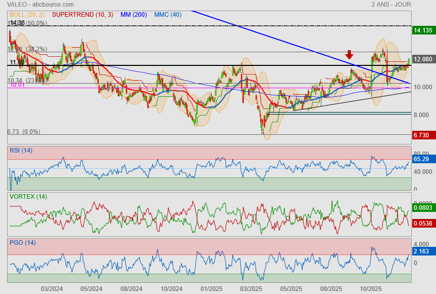 (Boursier.com) — En tête du SBF120, Valeo s'octroie 2,6% à 11,4 euros, dans le vert pour la troisième séance consécutive. Le titre est soutenu par l'annonce par les Etats-Unis d'une réduction des droits de douane sur la Corée du Sud et de ventes meilleures que prévu du constructeur électrique chinois BYD. Le secrétaire d'Etat américain au Commerce Howard Lutnick a confirmé lundi que le taux général des droits de douane sur les importations en provenance de Corée du Sud, y compris sur les automobiles, serait ramené à 15% avec effet rétroactif au 1er novembre.