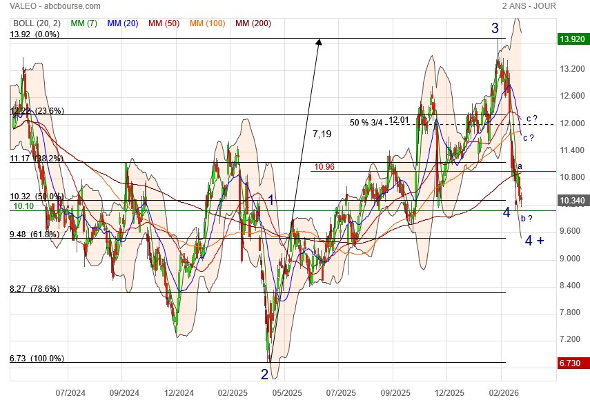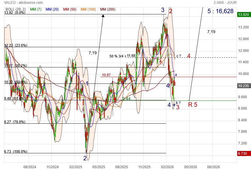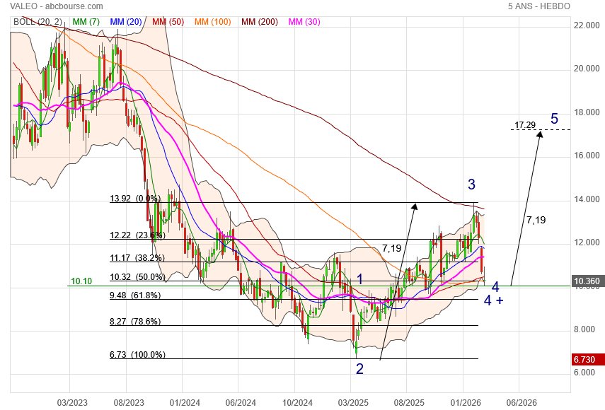 (Boursier.com) — Dans les dernières positions du palmarès, Valeo trébuche de 4,1% à 11,5 euros. En amont de sa journée investisseurs, l'équipementier automobile a présenté les objectifs de son nouveau plan stratégique 'Elevate'. Le groupe ambitionne d'atteindre un chiffre d'affaires de 22 à 24 milliards d'euros en 2028, avec un retour de la croissance à partir de 2027, ainsi qu'une progression de sa marge opérationnelle à 6-7% en 2028 et un cash-flow libre après frais financiers nets d'au moins 500 millions d'euros. Cette amélioration de la génération de cash ramènerait le ratio de leverage sous la barre de 1,0x l'EBITDA retraité, alignant ainsi les principaux indicateurs financiers du Groupe sur l'objectif d'une notation 'investment grade' en 2028.