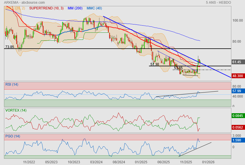 Thierry Le Hénaff, président-directeur général d' Arkema , était l'invité de l'émission Ecorama du 27 février 2026, présentée par David Jacquot sur Boursorama.com. Parmi les sujets abordés : les résultats 2025, la résilience de certaines activités comme les matériaux de spécialités, la dynamique contrastée entre les zones géographiques, la confirmation des investissements stratégiques, l'impact des décisions commerciales américaines, les attentes vis‑à‑vis du soutien européen au secteur de la chimie, ainsi que la politique de dividende.