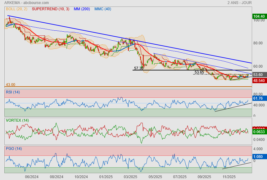 (Boursier.com) — Arkema recule de 3% à 80,9 euros en fin de matinée, sanctionné après des résultats et des objectifs 2025 un peu 'justes'. Dans un environnement macroéconomique qui reste incertain et marqué par une demande faible sur le début de l'année, le groupe vise en 2025 un EBITDA en hausse, situé entre 1,53 MdE et 1,67 MdE. Il prévoit également d'augmenter fortement son flux de trésorerie courant à environ 600 millions d'euros en 2025.