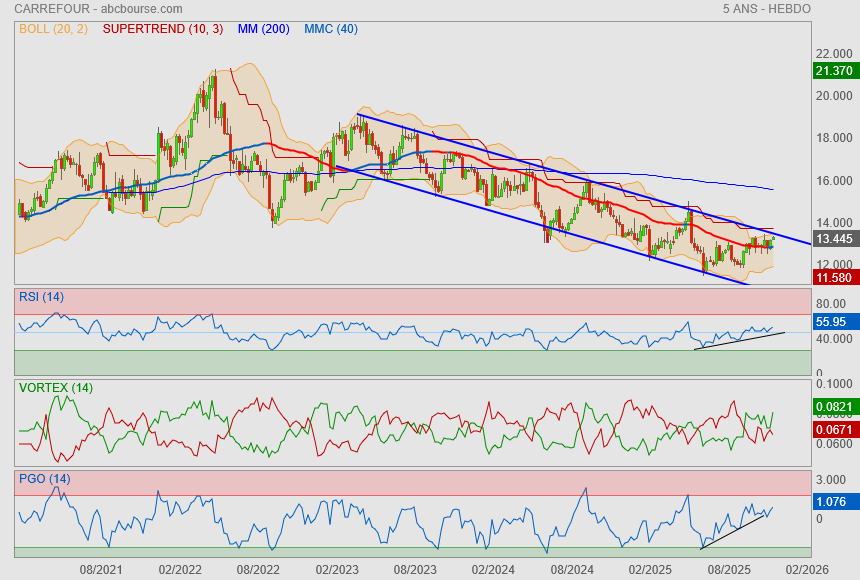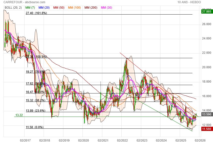 Du point de vue de l’analyse technique (analyse graphique et mathématique de l’évolution du cours de Bourse), le Loup de Zurich a détecté une vague de Wolfe (configuration classique de l’analyse technique) haussière. Un rebond sur le point 5 (voir graphique ci-après) ferait monter progressivement le cours de l'action Carrefour vers les niveaux indiqués sur le graphique, avec des objectifs à 12,55 euros, 13,36 euros, 14,07 euros et 15,79 euros, soit un fort potentiel d’appréciation en Bourse pour l’action Carrefour.