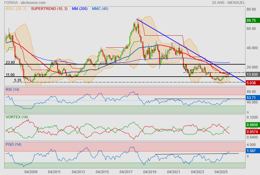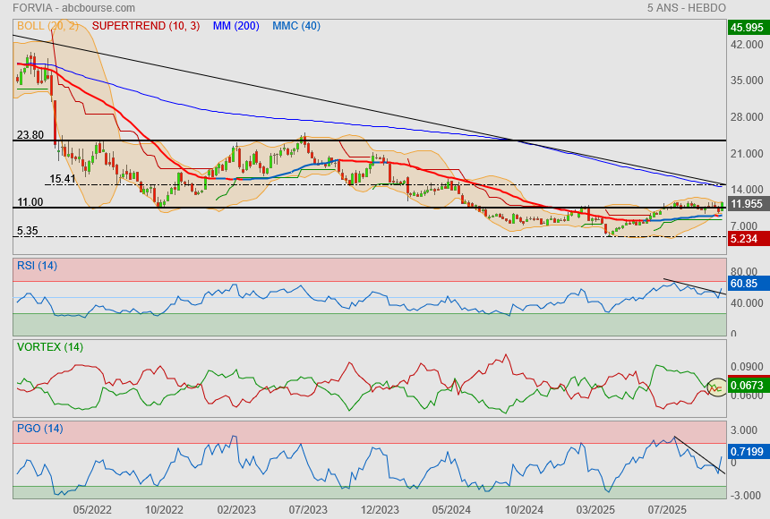 (Boursier.com) — Forvia bondit de près de 10% à 11,2 euros à l'ouverture du marché parisien, soutenu par un bon premier semestre et la confirmation de ses objectifs annuels. Le management a indiqué qu'il s'efforçait de réduire davantage ses coûts administratifs et industriels dans le cadre de son nouveau plan " Simplify ". Forvia, dont les ventes ont reculé de 0,4% au premier semestre à cause notamment des effets de change, a vu sa marge opérationnelle progresser de 20 points de base à 5,4% et son cash-flow net doubler à 418 millions d'euros. La firme a confirmé viser sur l'ensemble de 2025 un chiffre d'affaires compris entre 26,3 et 27,5 milliards d'euros, ainsi qu'une marge d'exploitation comprise entre 5,2% et 6% "en prenant en considération les droits de douane mis en place à ce jour".
