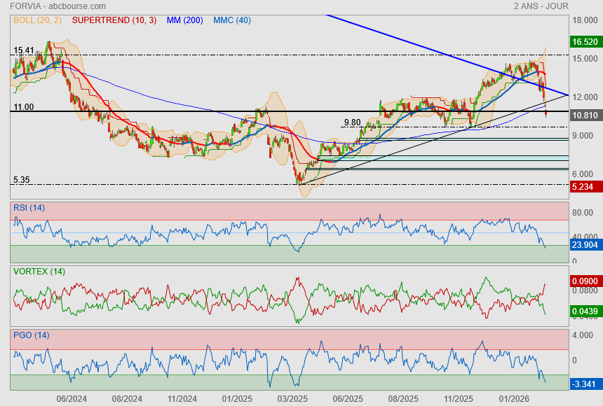 Forvia a notamment annoncé viser à cet horizon une croissance annuelle moyenne de 2% en données comparables et une marge opérationnelle d'au moins 7% (après 6% en 2025). Son ratio d’endettement (le résultat brut d'exploitation sur douze mois rapporté à la dette nette) doit être ramené à 1,2 après 1,7 en 2025 et 2 en 2024.