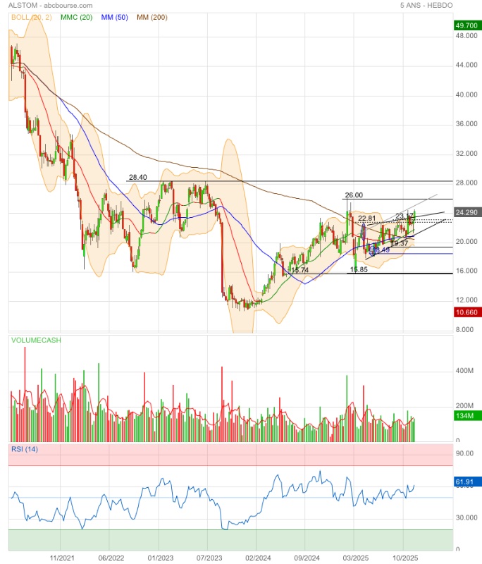 « Proche de 47€ dans les premiers jours de 2021, l’action Alstom était tombée vers 10€ début 2024 et, si elle dépasse les 20€ aujourd’hui, les records restent loin. En cause ? Pas le carnet de commandes du deuxième équipementier ferroviaire mondial, qui vole de record en record et s’approche de 100 milliards d’euros.