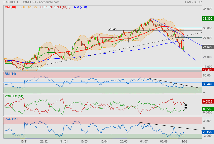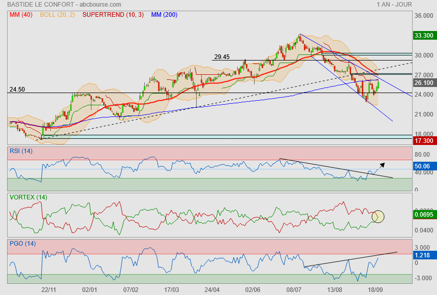 Bastide revient à 29 euros ce jeudi, alors que le titre a été recherché récemment après la cession de ses filiales françaises Cicadum, détenue à 51%, et Medsoft, détenue à 100%, toutes deux spécialisées en stomathérapie. Les deux filiales ont été vendues à leurs fondateurs. Sur l'exercice 2023-2024, Cicadum et Medsoft ont réalisé un chiffre d'affaires cumulé de 11 ME. Cette opération, réalisée en numéraire, aura un effet relutif sur la marge et contribuera à la réduction de la dette financière nette du Groupe Bastide. Le groupe poursuit par ailleurs l'étude de possibles cessions d'actifs qui ne répondraient plus à sa stratégie ou permettraient d'extérioriser la valeur créée par le groupe.