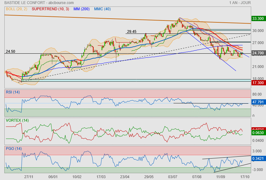 (Boursier.com) — Bastide s'adjuge plus de 5% à 25,70 euros ce lundi. Le dernier point semestriel du groupe a encouragé certains brokers à revenir sur le dossier : Bastide a réalisé au deuxième trimestre de son exercice 2024-205 un chiffre d'affaires de 141,4 ME, en croissance de 8,1% et de +7,8% en organique. Cette performance trimestrielle a porté le chiffre d'affaires semestriel à 275,2 ME, en hausse de 8,6%, dont +8,4% en organique. La direction a confirmé son objectif de chiffre d'affaires d'au moins 560 ME (sur le périmètre actuel, post cession de CICA Plus) pour l'exercice 2024-2025. Le groupe a également réitéré avec confiance son objectif de marge opérationnelle courante supérieure ou égale à 8,7% en 2024-2025, bénéficiant à la fois de la politique de contrôle des coûts et de la progression de la part des activités à plus forte valeur ajoutée dans le chiffre d'affaires...