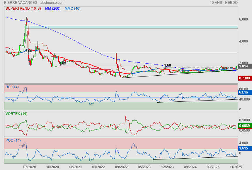 Pierre et Vacances Center Parcs avance timidement de 0,6% à 1,82 euro en cette fin de semaine légèrement baissière à Paris. Le groupe de loisirs a fait état, au titre de son premier trimestre 2025/2026, d'une hausse de près de 7% de son chiffre d'affaires avec une trajectoire positive pour l'ensemble des indicateurs de chaque marque. Au niveau des perspectives, le management a indiqué que le portefeuille de réservations touristiques engrangé à date pour le 2ème trimestre de l'exercice en cours est en hausse par rapport à celui de l'exercice précédent, pour l'ensemble des marques du Groupe. La croissance de l'activité est tirée à la fois par une hausse du prix moyen de vente et par un effet volume.
