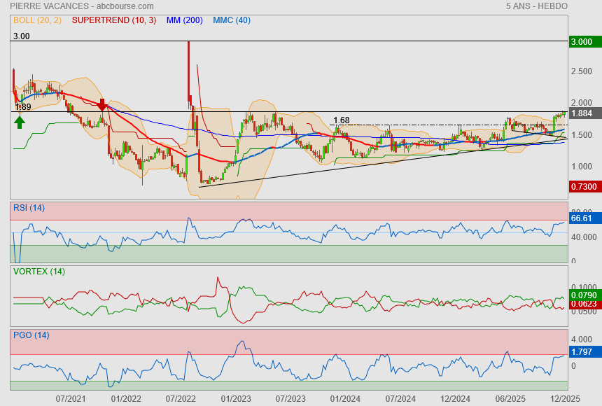 (Zonebourse.com) - Oddo BHF confirme son conseil de "surperformance" sur le titre Pierre & Vacances, avec un objectif de cours relevé de 2,2 à 2,3 euros, contre un cours de 1,67 euro au 4 décembre 2025, soit un potentiel d'appréciation d'environ 38%.