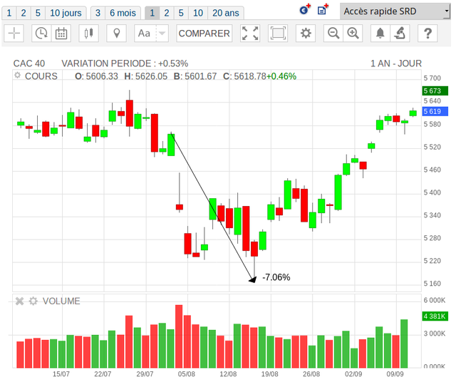 Coup de chapeau pour l' absurdité de la prédiction de christof car ouverture de cette file le 14 août 2019 avec un cac en clôture ce jour là à 5251.30 points et nous sommes rendus à 5941.03 points ce 19 novembre 2019 donc cela fait + 13.13 % .